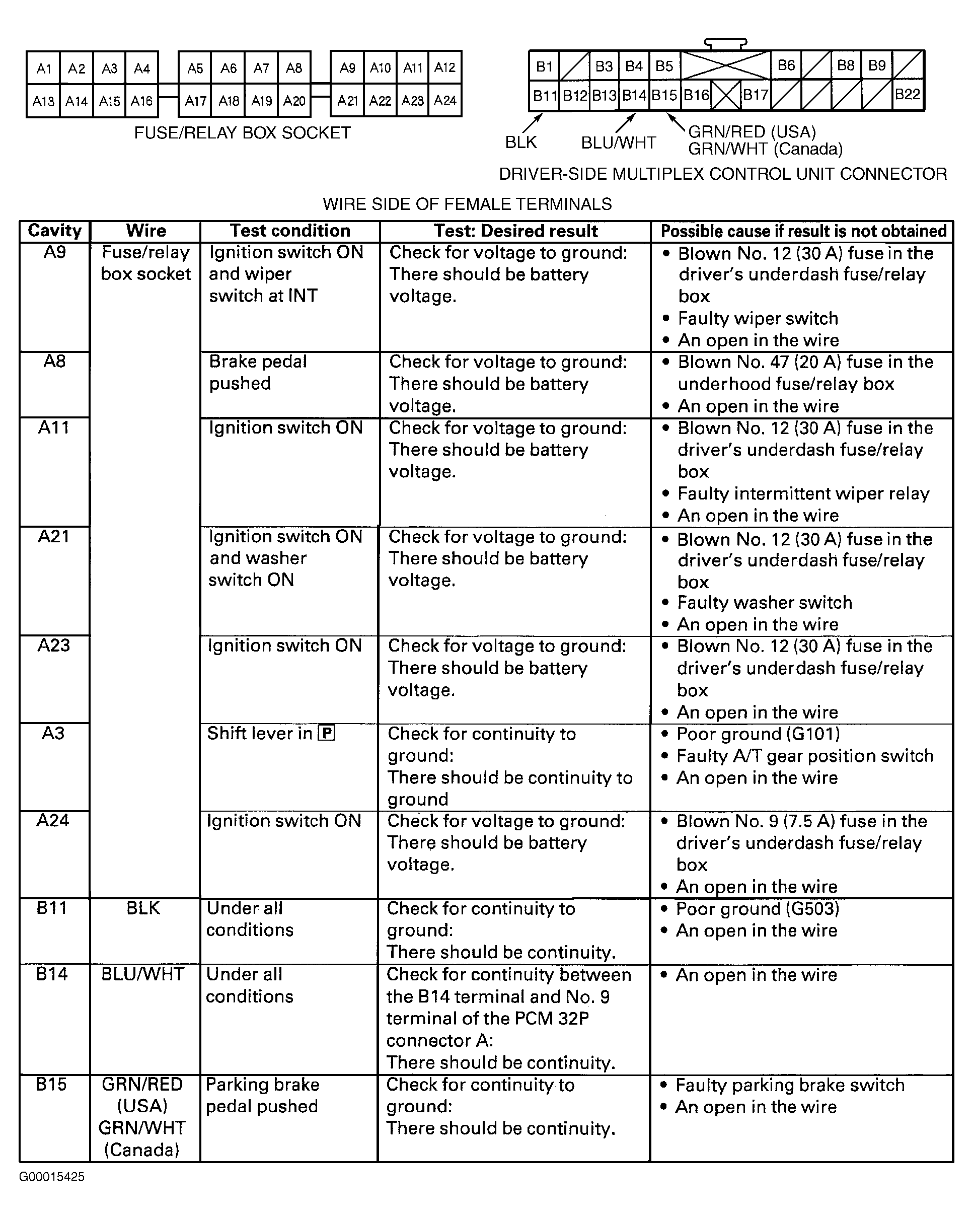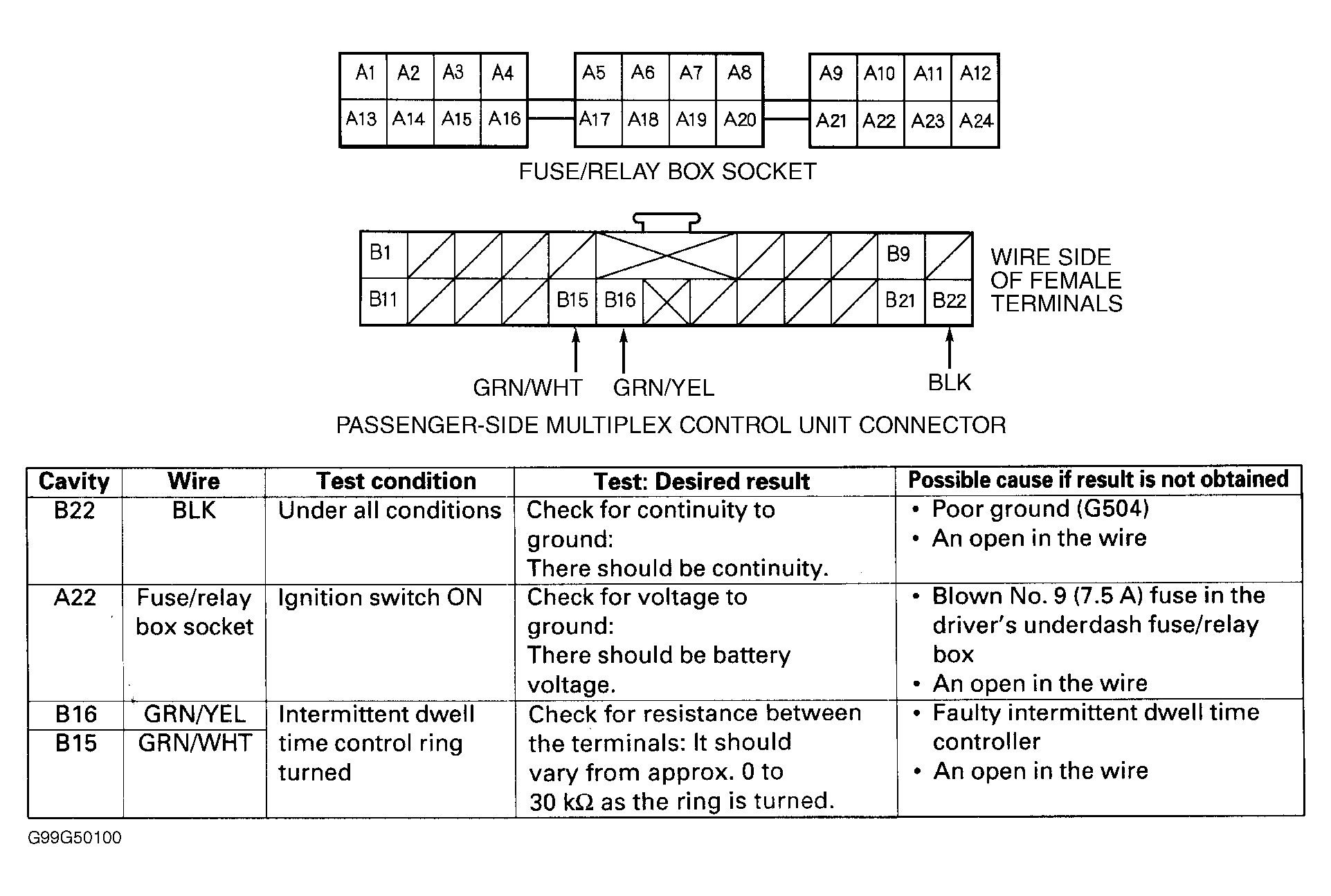 - With passenger's multiplex control unit disconnected, perform tests specified at passenger's underdash fuse/relay box sockets and multiplex control unit connector. See Fig 2
