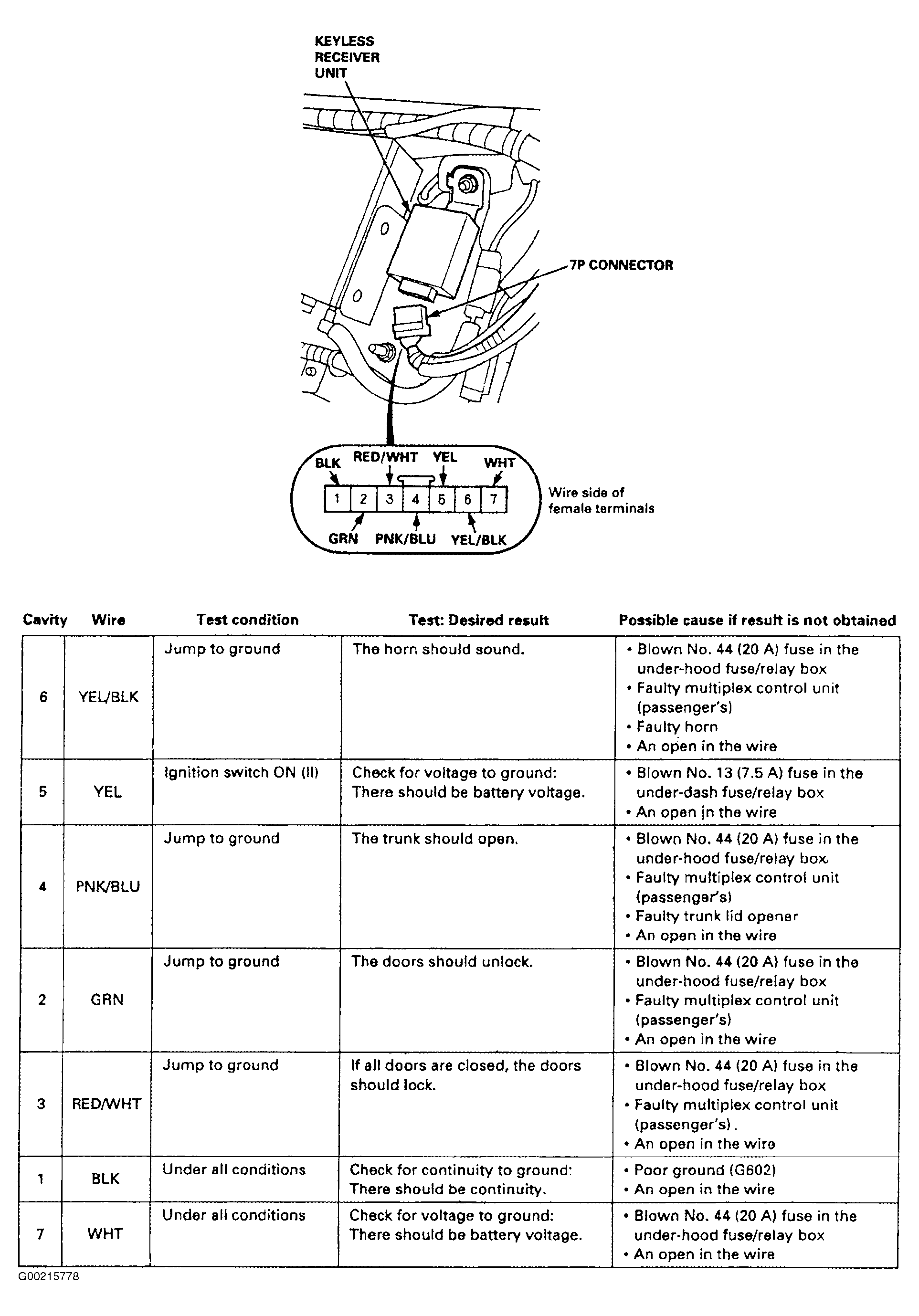 Home >> Acura >> 2002 >> 3.5RL >> Repair and Diagnosis (Single Page) >> Body & Frame >> Door Locks >> Anti-Theft & Keyless Entry Systems >> Component Tests >> Keyless Receiver Unit Input