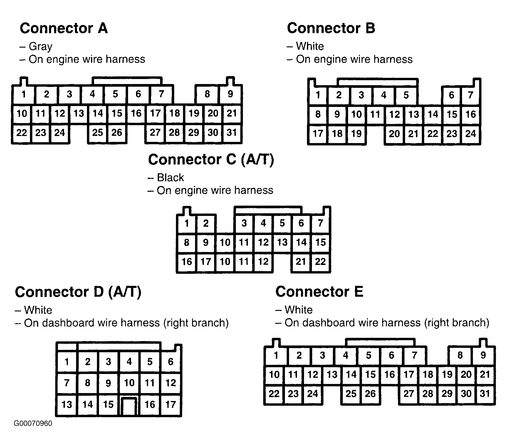 4. Turn ignition switch off. Disconnect PSP switch 2-pin harness connector. Turn ignition switch on. Measure voltage by backprobing between Gray 31-pin ECM/PCM harness connector terminal No. 24 (Brown/Yellow wire) and White 31-pin ECM/PCM harness connector terminal No. 16 (Light Green/Black wire). See Figure . If battery voltage is not present, go to next step. If battery voltage is present, replace PSP switch.