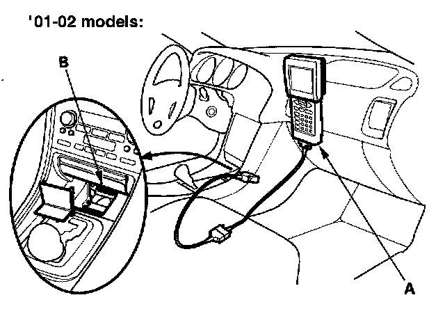 2. If the MIL stays on, connect the Honda PGM Tester (A) or an OBDII scan tool to the Data Link Connector (DLC) (B) located under the coin box.