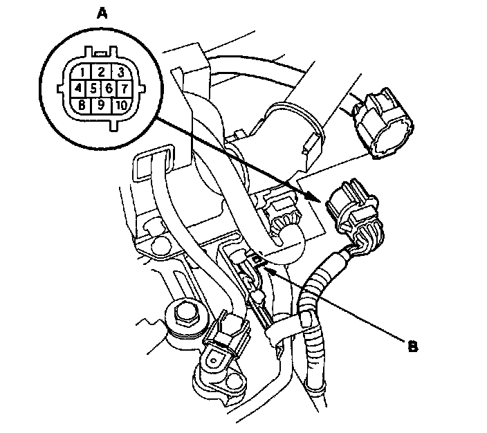 1. Remove the transmission range switch connector (A) from the connector bracket (B), then disconnect the connector.
