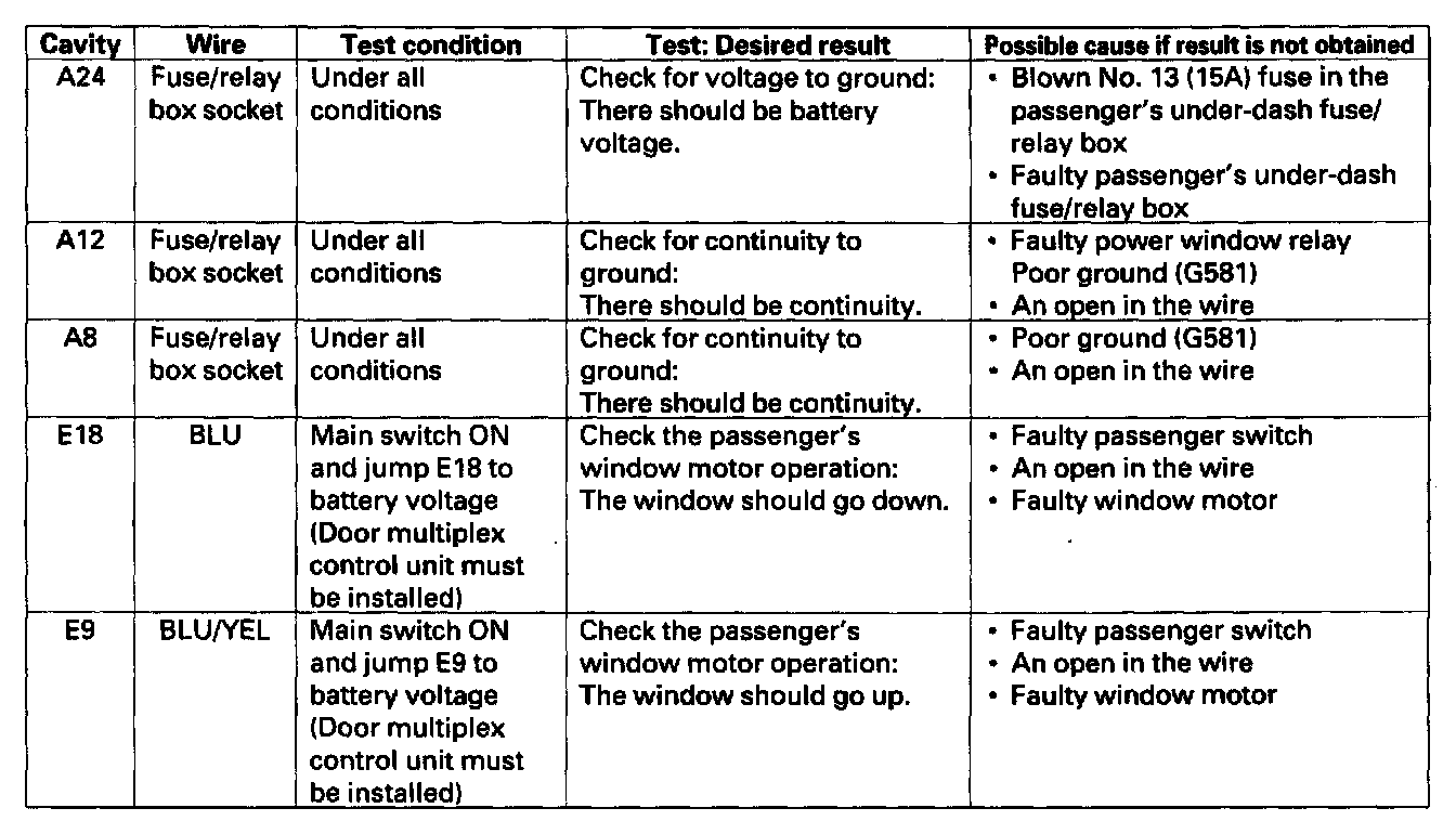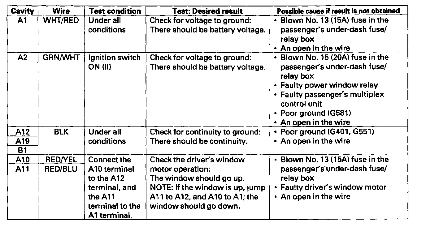 Home >> Acura >> 2002 >> CL V6-3.2L SOHC >> Repair and Diagnosis >> Windows and Glass >> Windows >> Power Window Control Module >> Testing and Inspection