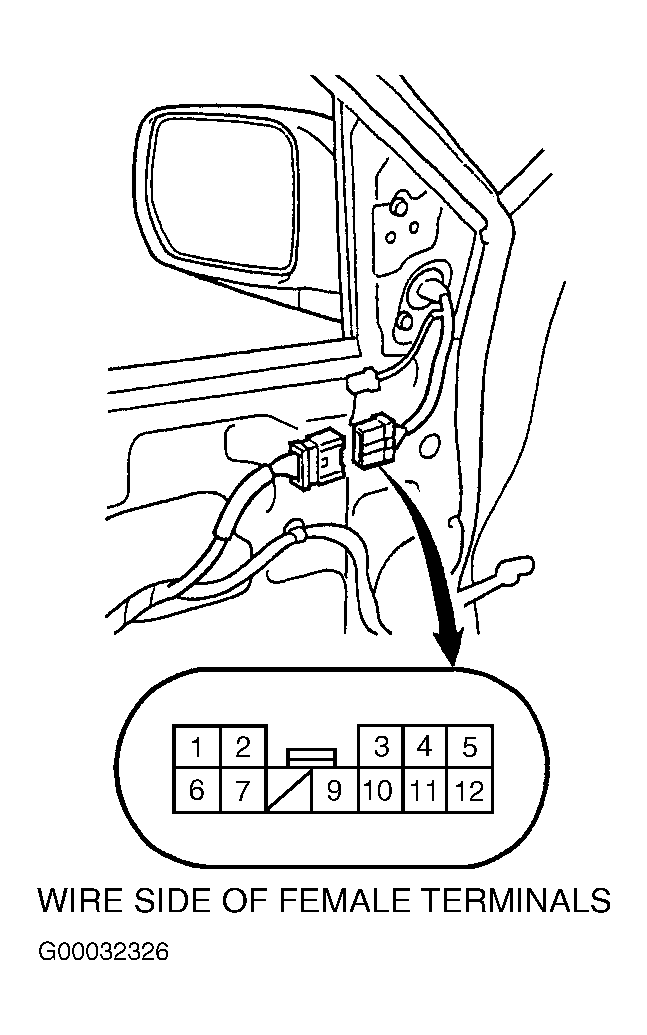 Remove appropriate door panel and disconnect power mirror motor connector. See DOOR PANEL  under REMOVAL & INSTALLATION. See Fig 1 . Using fused jumper wires, check motor operation by applying power and ground as specified. See POWER MIRROR MOTOR TEST  table. If motor does not function as specified, replace appropriate motor assembly.
