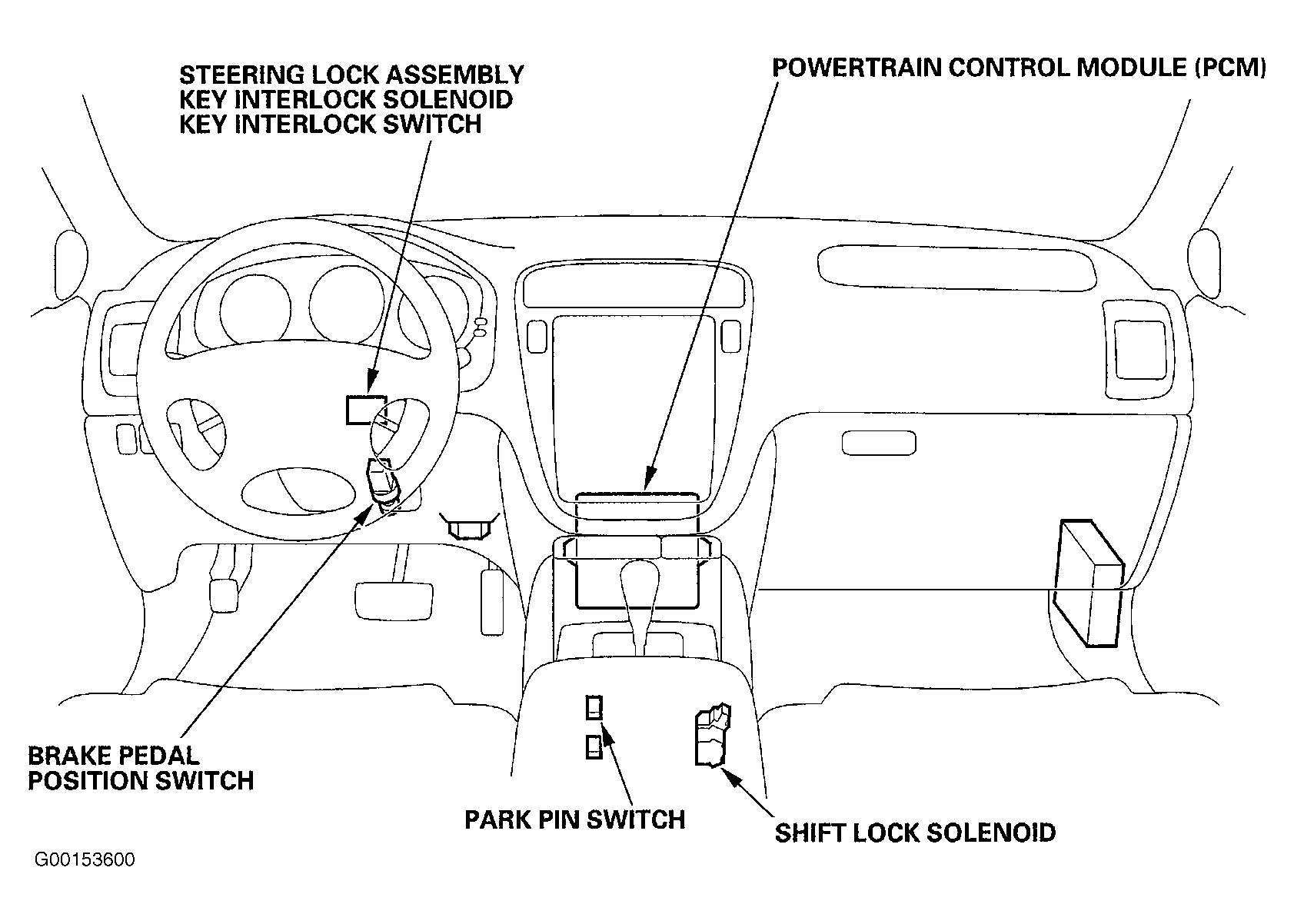 - Check that the shift lock solenoid operates. Does the shift lock solenoid operate properly? If yes, check for open in the wire between PCM connector terminal A28 and the shift lock solenoid. If no, replace the shift lock solenoid. See SHIFT LOCK SOLENOID under REMOVAL & INSTALLATION.