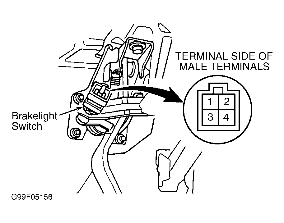 - Press the brake pedal and measure the voltage between PCM connector terminals A32 and B20 or B22. See Figure. Is there battery voltage? If yes, release the brake pedal and go to next step. If no, repair open in the wire between PCM connector terminal A32 and the brake pedal position switch. For brake pedal position switch harness connector terminal identification, see Fig 1.