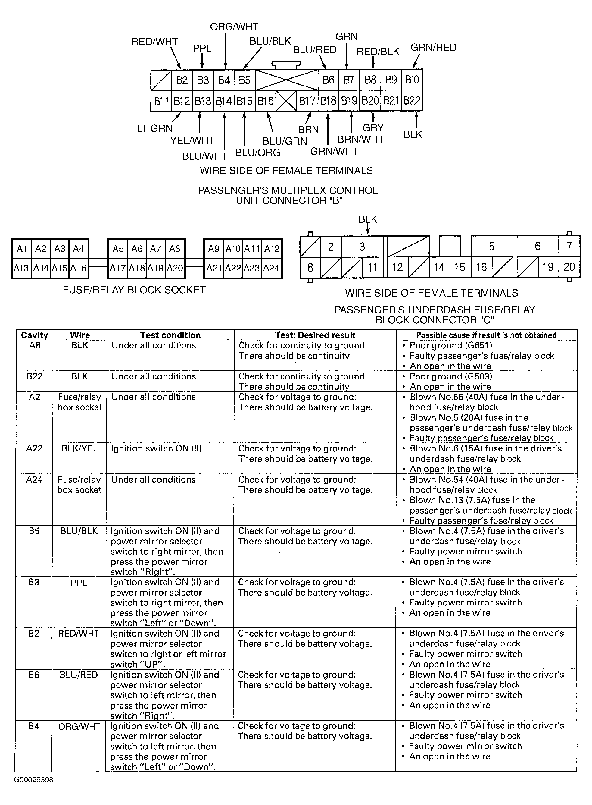 2. Using DVOM to backprobe, measure voltage between passenger's multiplex control unit connector terminals B2 (Red/White wire) and B22 (Black wire) while holding mirror switch UP. If battery voltage exists, go to next step. If battery voltage does not exist, repair open circuit in Red/White wire between passenger's multiplex control unit and power mirror switch, or in Black wire between passenger's multiplex control unit and ground. See WIRING DIAGRAMS  .