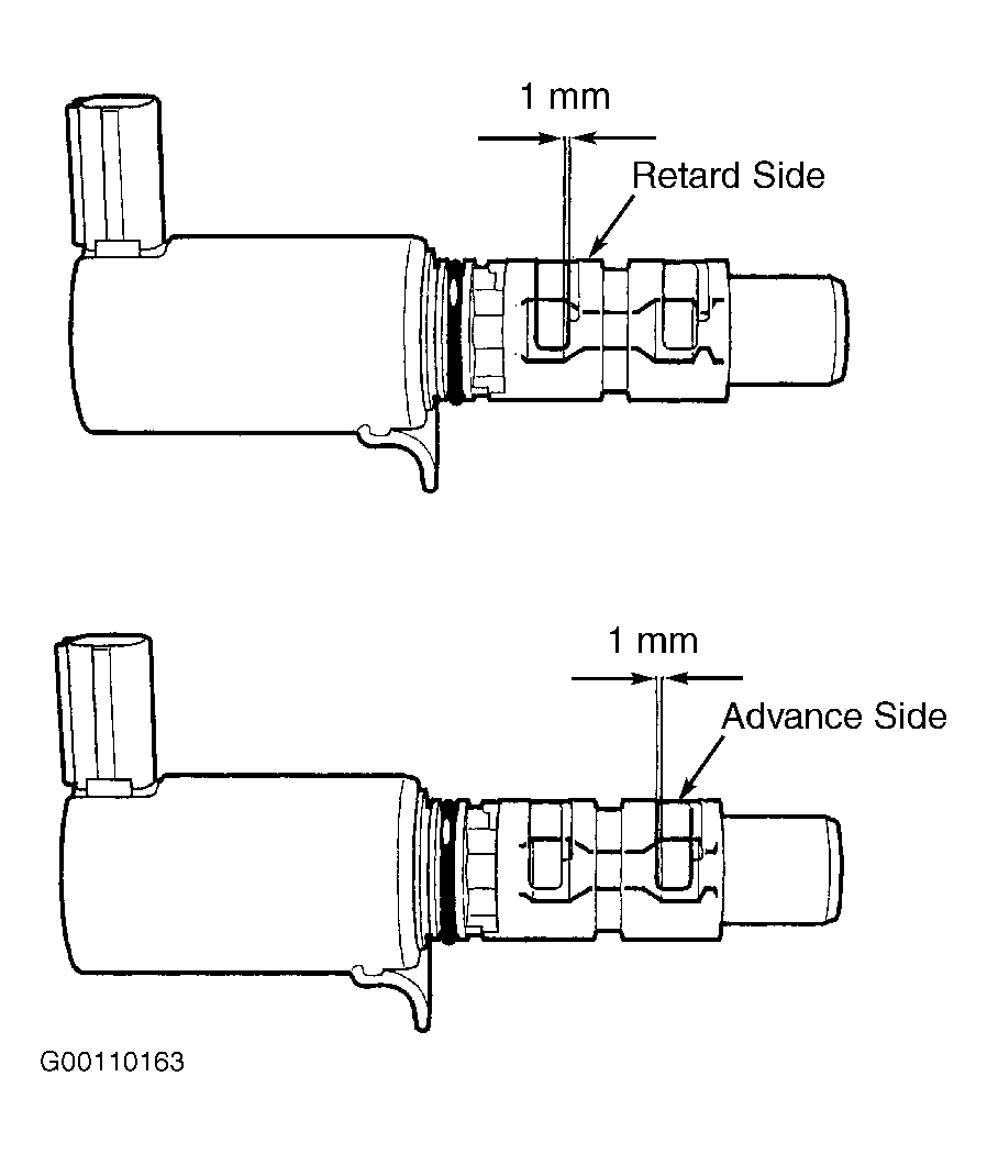 Disconnect 2-pin connector from VTC oil control solenoid valve. Remove retaining bolt. Remove VTC oil control solenoid valve. Measure clearance between port on retard side and valve. See Fig 1 . Clearance should be more than 1mm. Connect battery positive to terminal No. 2 and battery negative to terminal No. 1. Measure clearance between port on advance side and valve. Clearance should be more than 1mm. Disconnect 2-pin connector from VTC oil control solenoid valve.