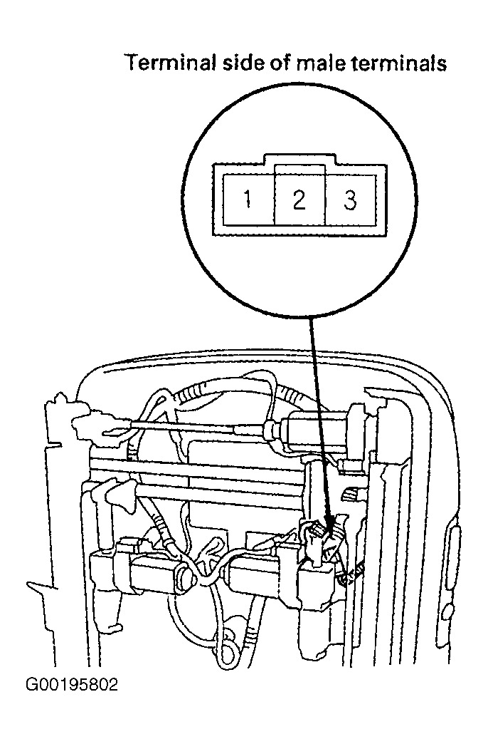 Remove power seat adjustment switch cover. See FRONT SEATS under REMOVAL & INSTALLATION. Disconnect 3-pin connector from recline switch. See Fig 1 . Using a DVOM, check for continuity between terminals. When seat is tilted forward fully, continuity should exist between terminals No. 3 and 2. When seat is tilted back fully, continuity should exist between terminals No. 1 and 2. If continuity is not as specified, replace limit switch.