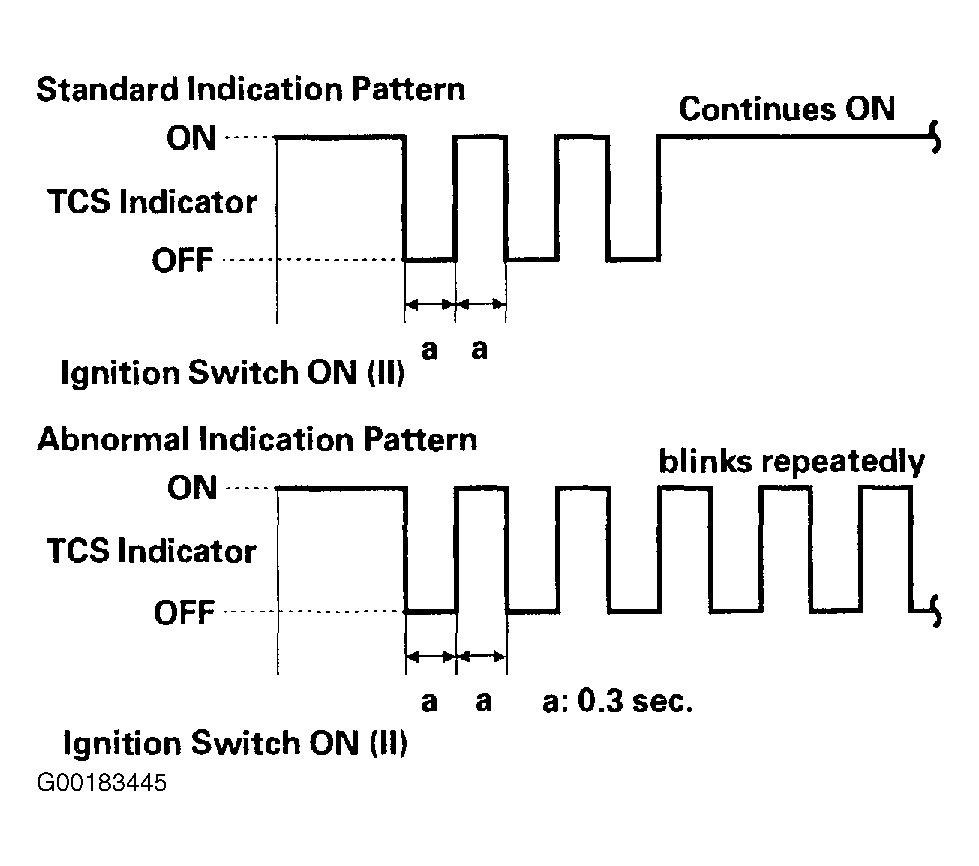 Within 6 seconds, turn the ignition switch back ON for at least 4 seconds, then release the TCS switch, and watch the TCS indicator. After a few seconds, the TCS indicator will come on after blinking to indicate that the DTC is cleared. If the indicator blinks repeatedly, repeat previous steps. See Fig 1 .