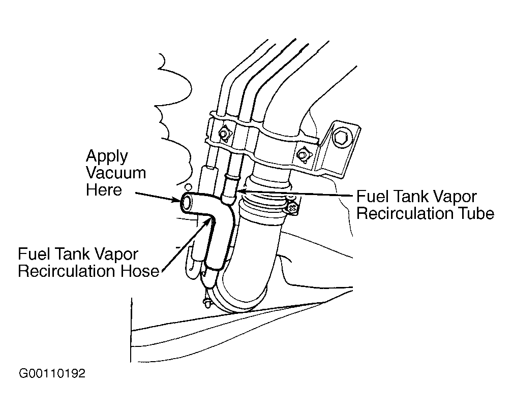 Ensure fuel tank is less than half full. Remove fuel filler cap to relieve fuel tank pressure, then reinstall cap. Disconnect fuel tank vapor recirculation tube. See Fig 1 . Connect a vacuum pump to vapor recirculation hose coming from fuel tank. Plug tube. Apply vacuum to fuel tank vapor recirculation hose. If vacuum holds, replace fuel tank vapor control valve. See EMISSION SYSTEMS & SUB-SYSTEMS in REMOVAL & INSTALLATION article. If vacuum does not hold, float is okay. Perform valve test. See VALVE TEST .
