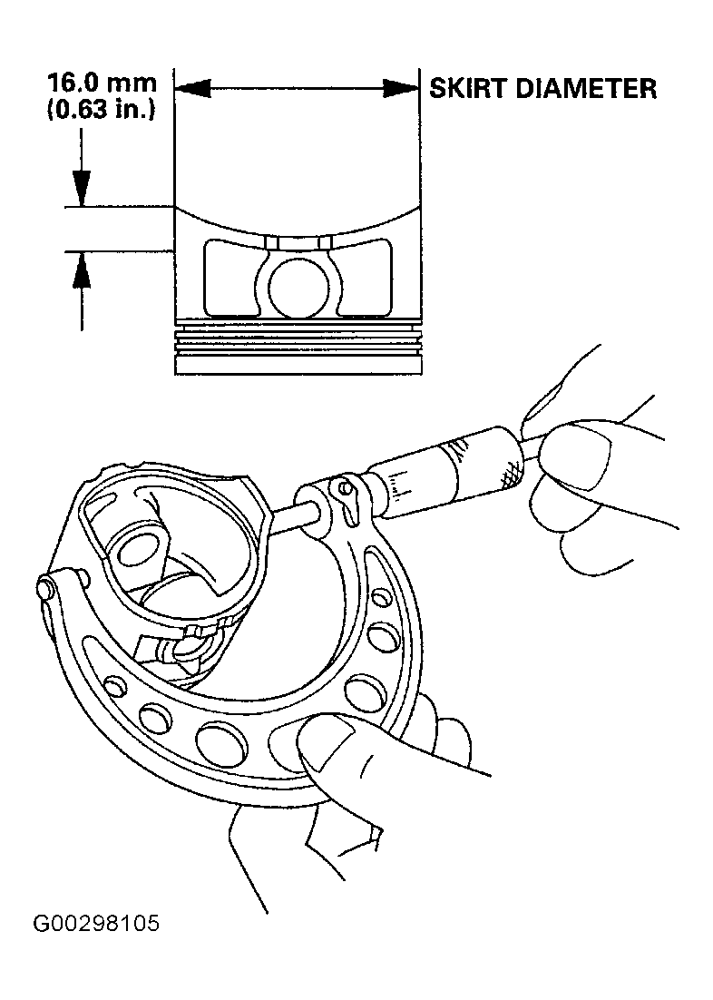 - Measure the piston diameter at a point .63" (16 mm) from the bottom of the skirt. See Fig 1 and PISTON & OVERSIZE PISTON DIAMETER table.PISTON & OVERSIZE PISTON DIAMETER