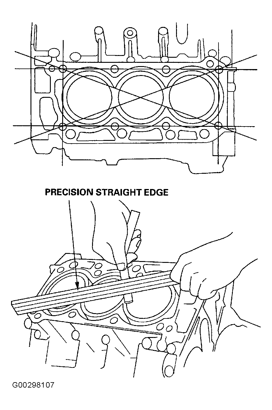 - Check the top of the cylinder block for warpage. Measure along the edges and across the center. See Fig 3 and CYLINDER BLOCK WARPAGE table.CYLINDER BLOCK WARPAGE