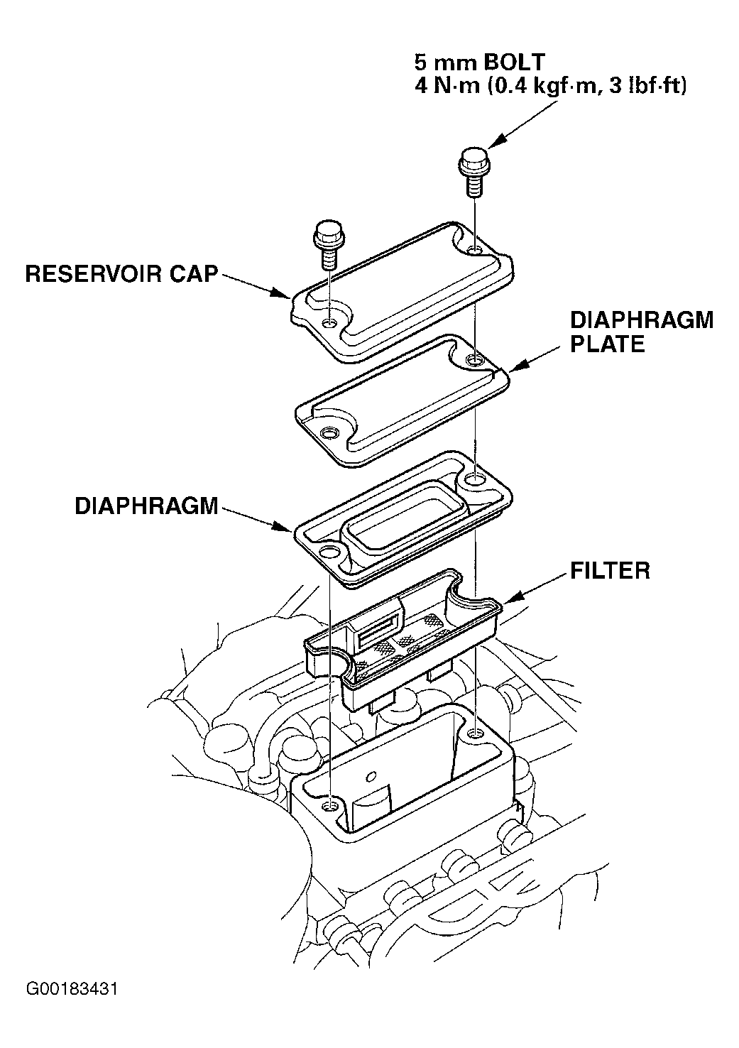 - Install in reverse order of removal and hand tighten the bolts. Operate the pump motor by driving the vehicle at 6 MPH or more. Repeat all steps and test drive the vehicle at 18 MPH or more for a few seconds, and check that the ABS indicator and VSA indicator do not come on. Tighten the VSA reservoir cap bolts to the specified torque. See TORQUE SPECIFICATIONS .