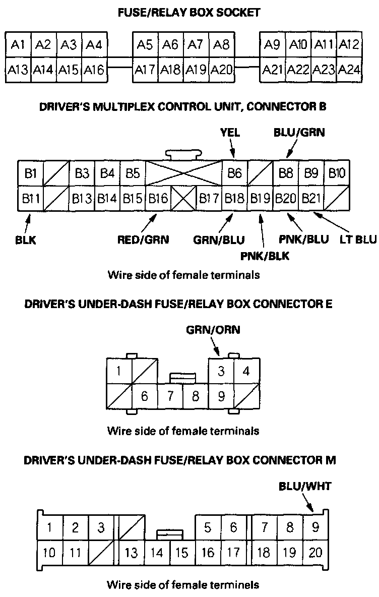 5. Reconnect the driver's multiplex control unit to the driver's under-dash fuse/relay box, and perform the following input tests at the appropriate connectors on the back of the driver's under-dash fuse/relay box. For driver's under-dash fuse/relay box connector socket location.