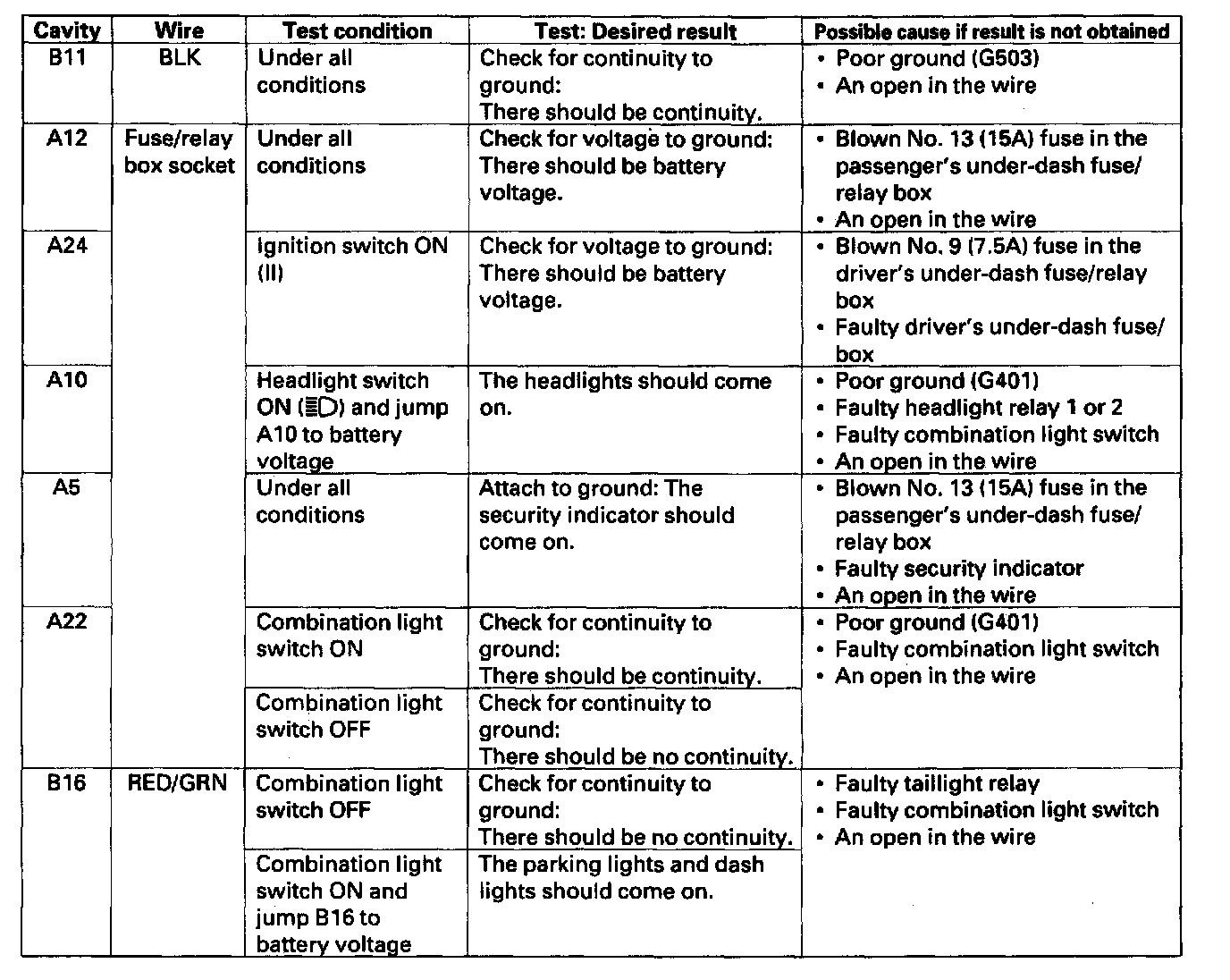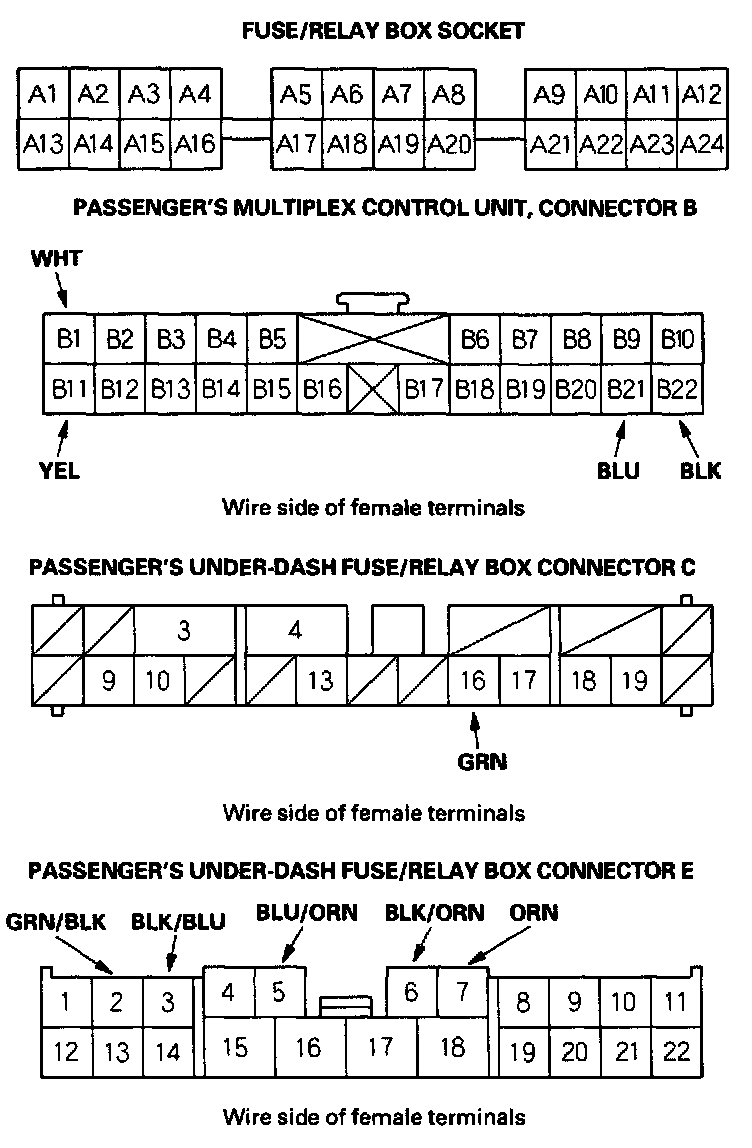 8. With the passenger's multiplex control unit still disconnected, make these input tests at the connectors and the passenger's under-dash fuse/relay box sockets.
