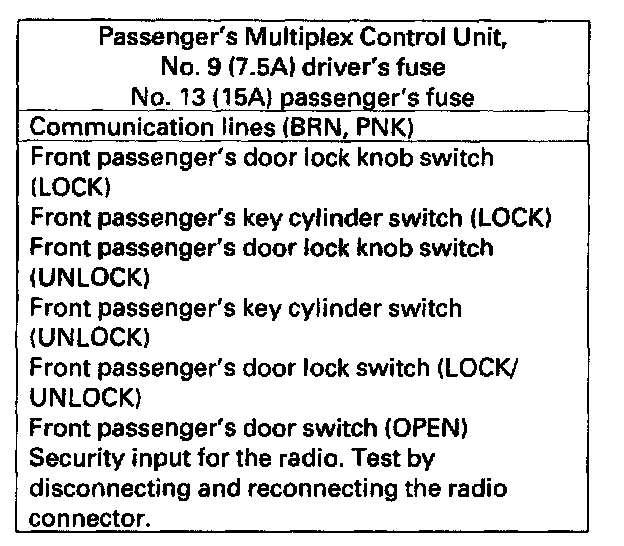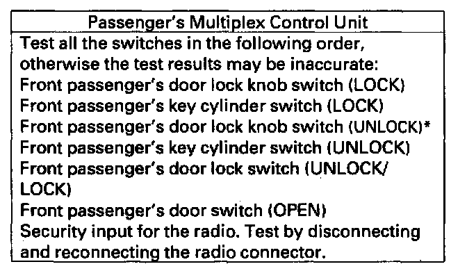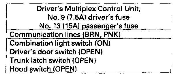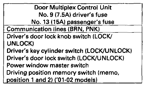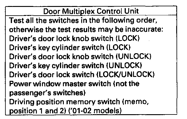 Home >> Acura >> 2003 >> 3.2CL V6-3.2L SOHC >> Repair and Diagnosis >> Body and Frame >> Mirrors >> Memory Positioning Systems >> Testing and Inspection >> Component Tests and General Diagnostics >> Multiplex Control System Troubleshooting