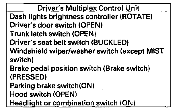 - Make sure the exterior lights are off. If you do not operate any switches related to the multiplex control units within 1 minute after meeting the above conditions, the system function shifts to the sleep mode. (All of the switches must be turned OFF except door lock knob switches).Go to step 12.