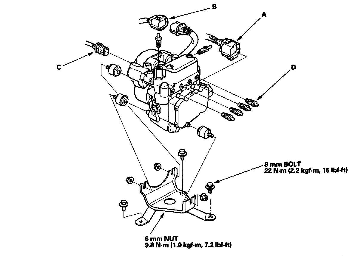2. Disconnect the six brake lines (D), then remove the modulator unit.