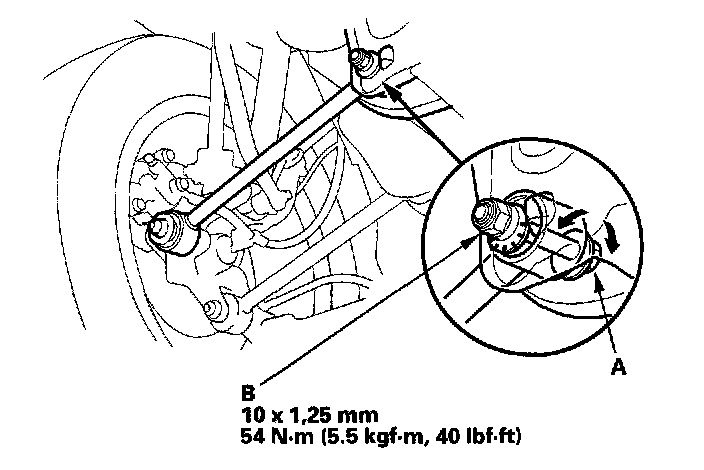 3. Hold the adjusting bolt (A) on the rear control arm, and loosen the self-locking nut (B).