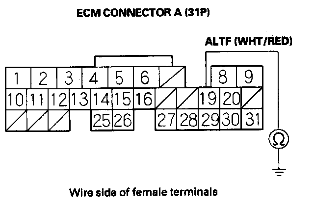 15. Check for continuity between body ground and ECM connector terminal A19.