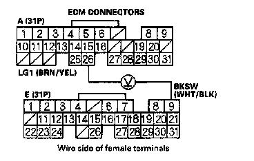 3. Measure voltage between ECM connector terminals A26 and E9 with the brake pedal pressed.