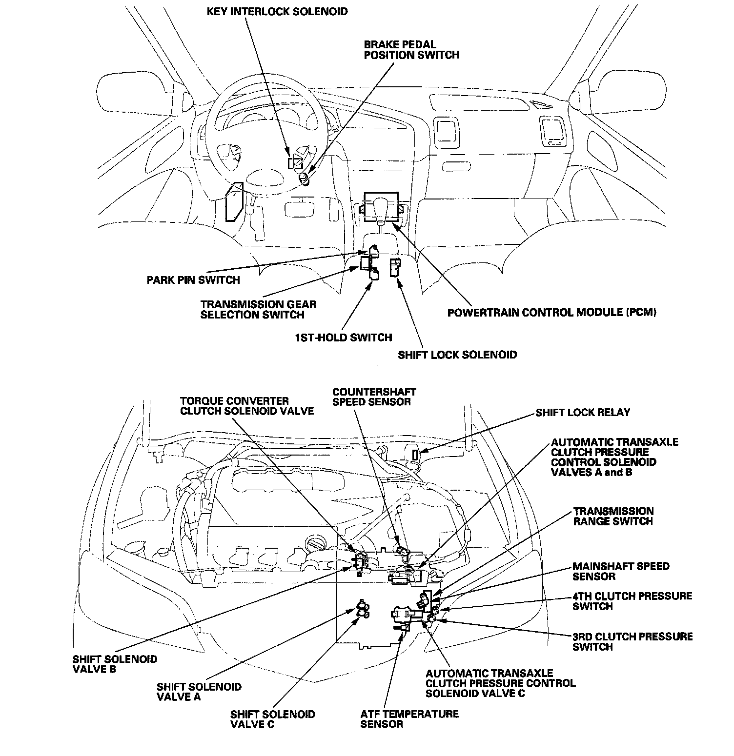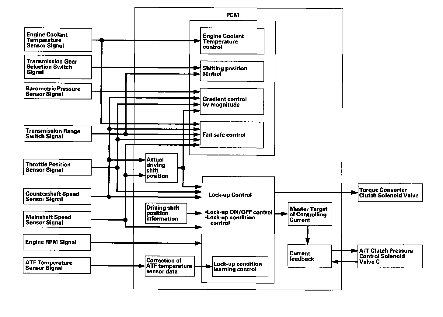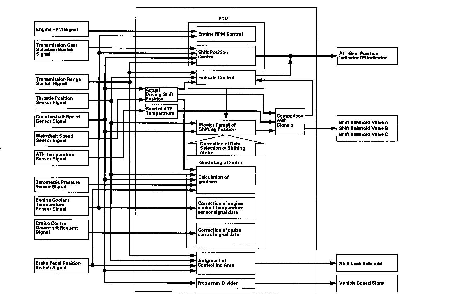 The PCM receives input signals from the sensors, switches, and other control units, perform processing data, and outputs signals for the engine control system and A/T control system. The A/T control system includes shift control, grade logic control, clutch pressure control, and lock-up control is stored in the PCM. The PCM switches the shift solenoid valves and the A/T clutch pressure control solenoid valves to control shifting transmission gears and lock-up torque converter clutch.
