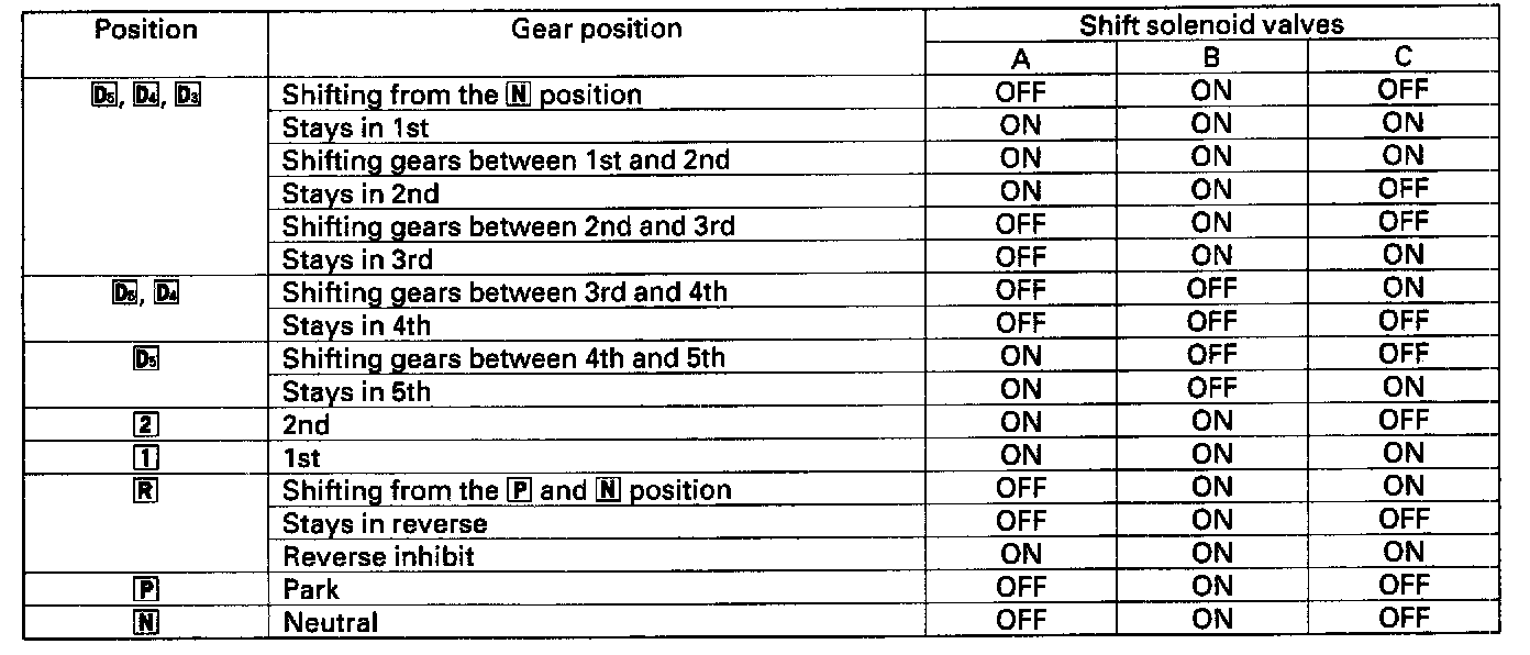 The combination of driving signals to shift solenoid valves A, B, and C are shown in the table.