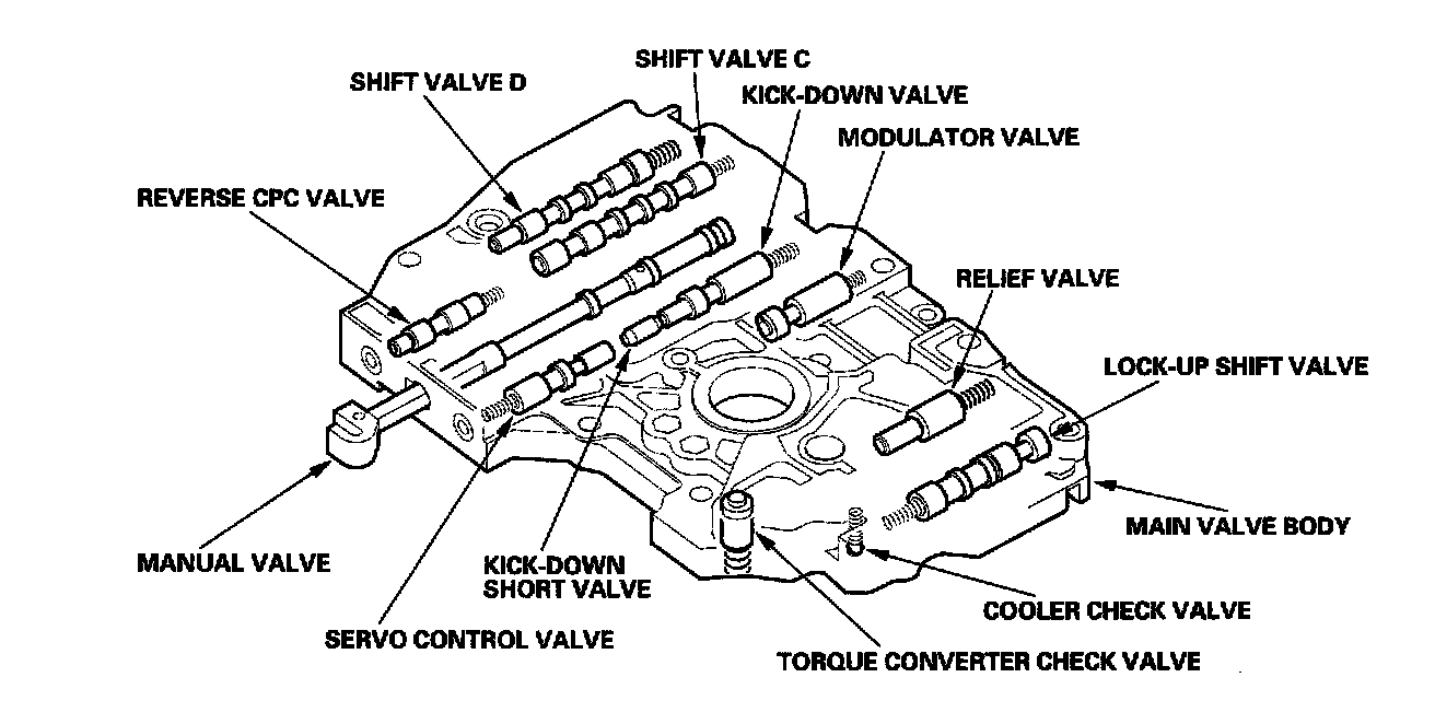 The main valve body contains the manual valve, the modulator valve, the shift valve C, the shift valve D, the servo control valve, the cooler check valve, the torque converter check valve, the reverse CPC valve, the lock-up shift valve, the relief valve, the kick-down valve, the kick-down short valve, and the ATF pump gears. The primary function of the main valve body is to switch fluid pressure on and off and to control hydraulic pressure going to the hydraulic control system.