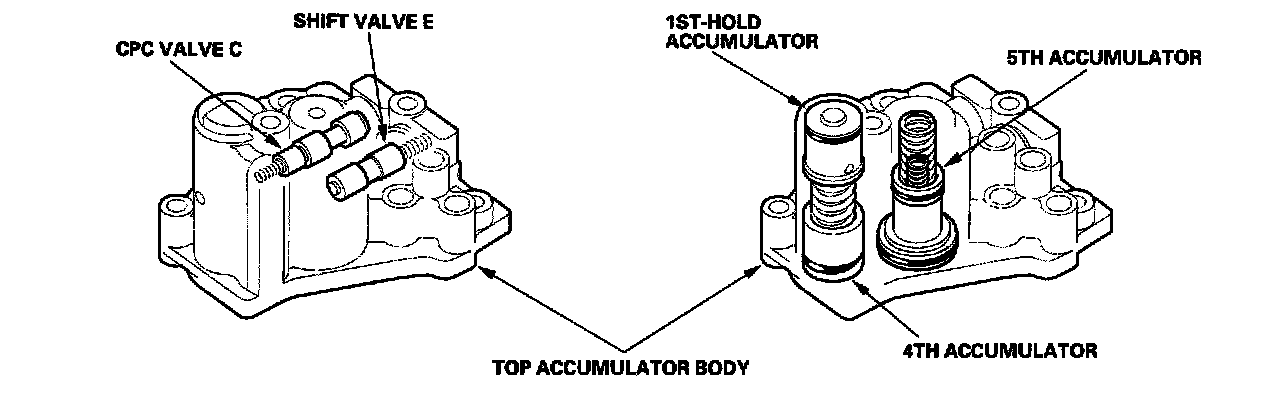 The top accumulator body contains shift valve E, CPC valve C, 4th/1st-hold accumulator, and 5th accumulator.