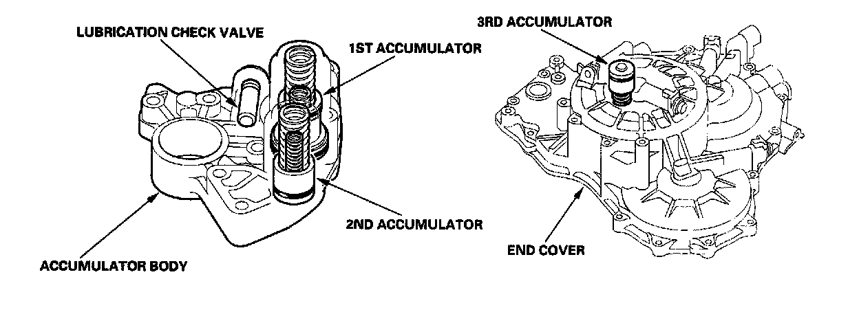 The accumulator body is on the torque converter housing, next to the main valve body. It contains the 1st and 2nd accumulators and the lubrication check valve.