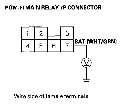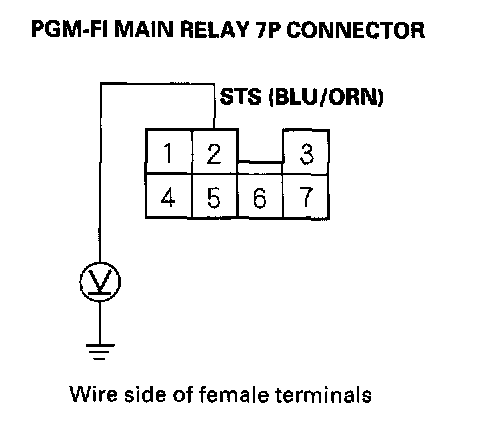 7. Push the clutch pedal in, or shift to Park, then turn the ignition switch to the START (III) position, and measure voltage between body ground and the PGM-FI main relay 7P connector terminal No.2.