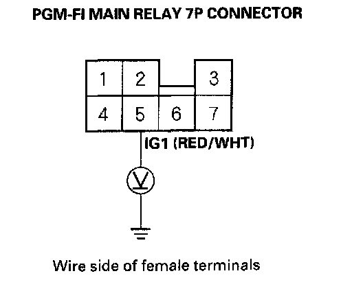 5. Turn the ignition switch ON (II), and measure voltage between body ground and the PGM-FI main relay 7P connector terminal No.5.