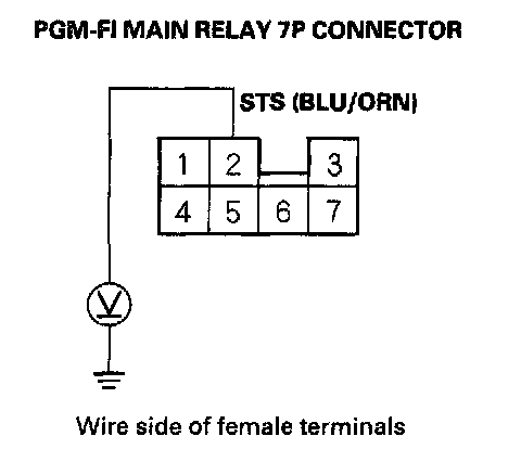7. Push the clutch pedal in, then turn the ignition switch to the START (III) position, and measure voltage between body ground and PGM-FI main relay 7P connector terminal No.2.