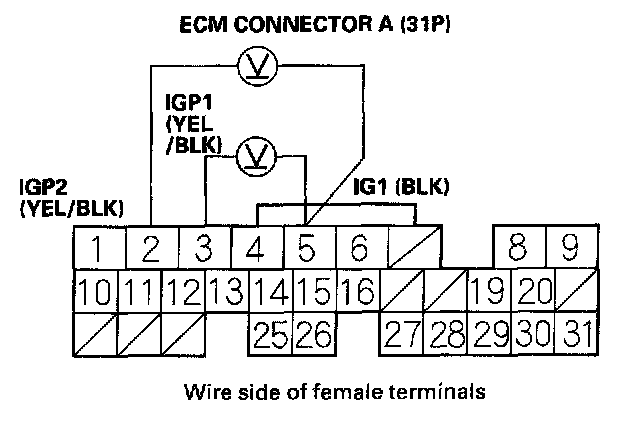 12. Turn the ignition switch ON (II), and measure voltage between ECM connector terminals A3 and A5, and between A2 and A5.