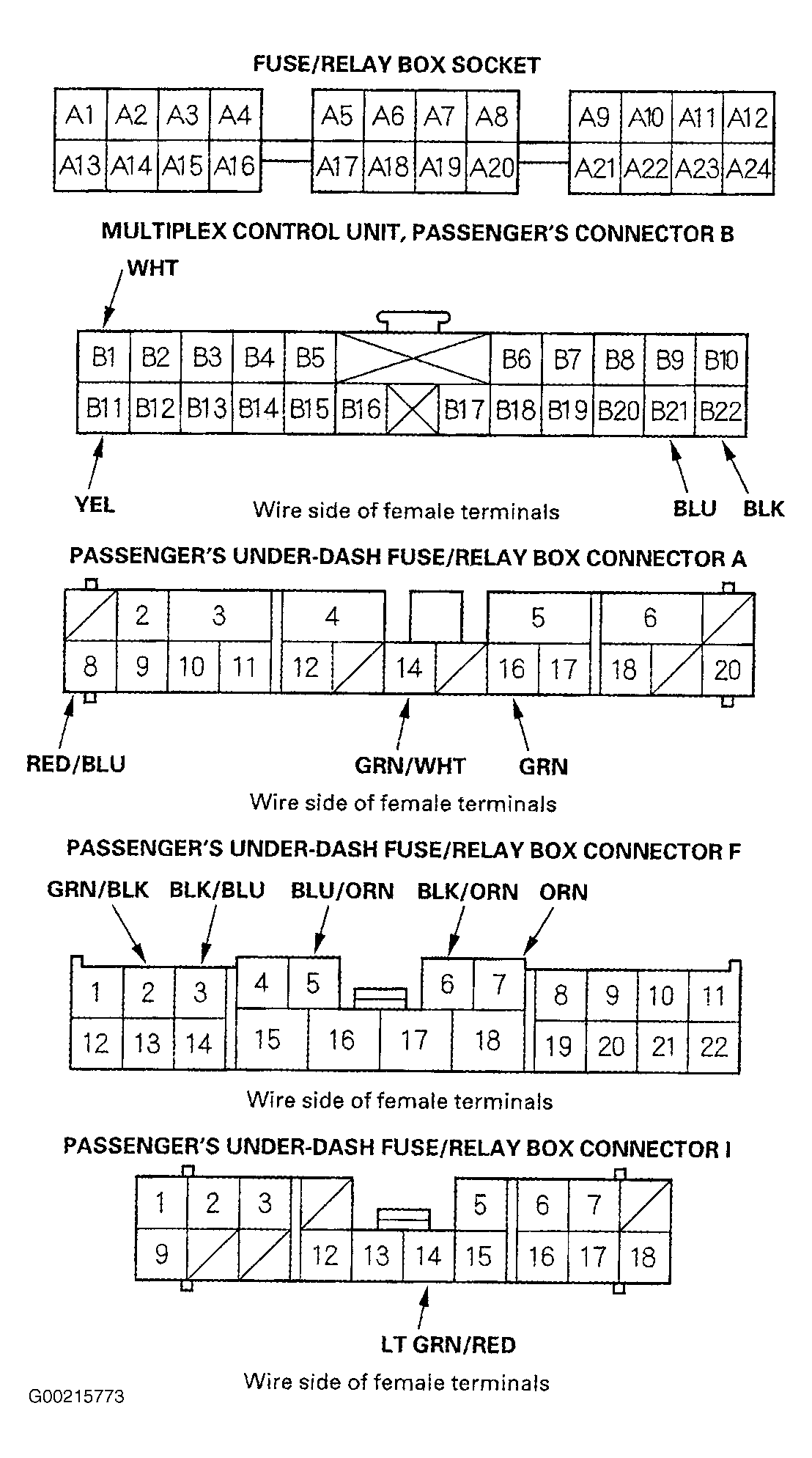 under REMOVAL & INSTALLATION. Remove passenger's multiplex control unit from passenger's underdash fuse/relay box. Disconnect passenger's multiplex control unit 22-pin connector. Inspect connectors and terminals. Check for bent, loose or corroded terminals. Perform passenger's multiplex control unit input tests. See Fig 1