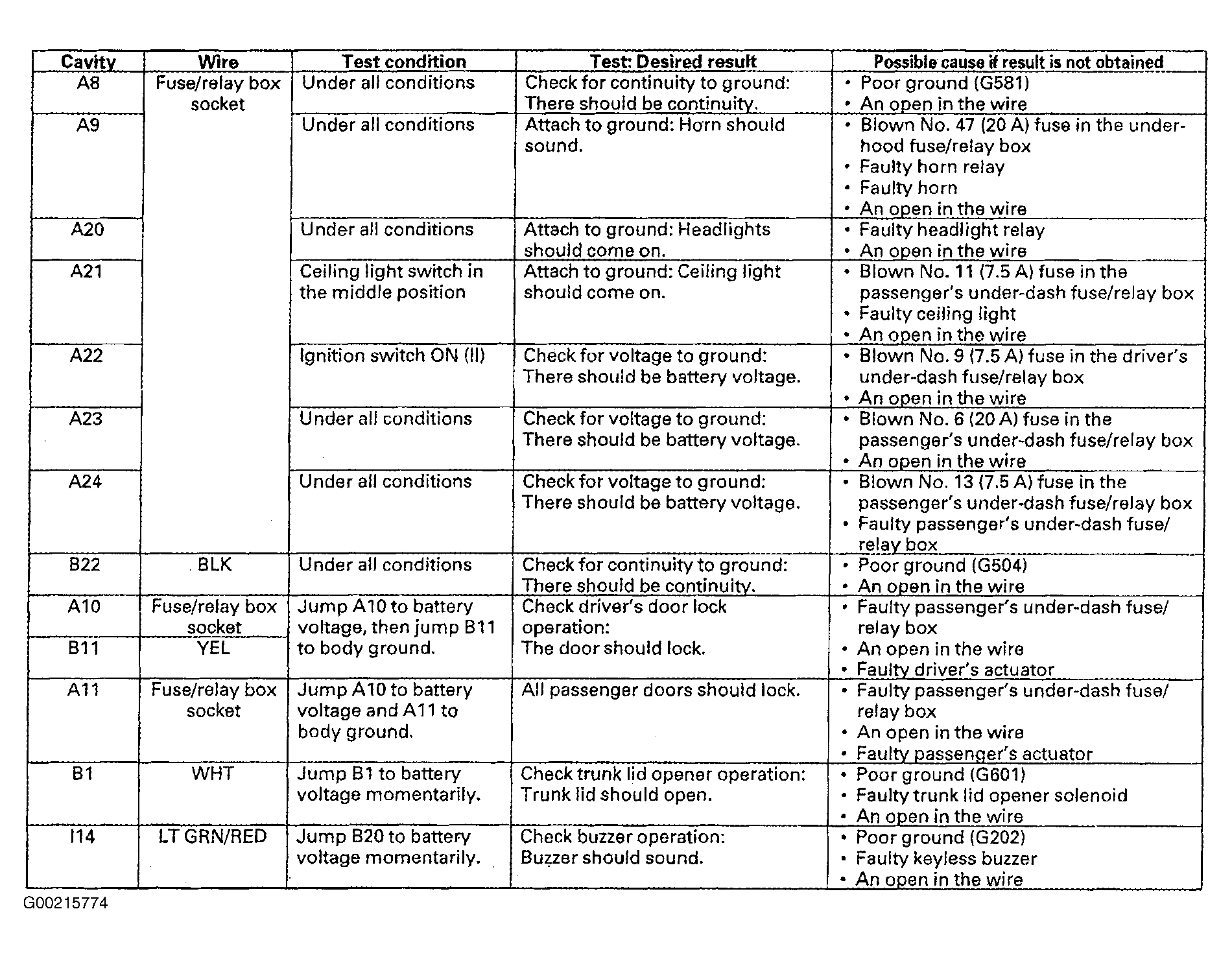 - Reconnect passenger's multiplex control unit to underdash fuse/relay box. Perform input tests as specified at back side of passenger's fuse/relay box (backprobe). See Fig 1