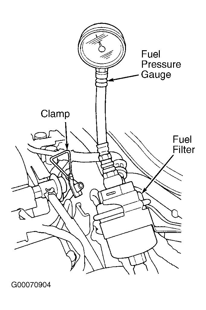 1. Relieve fuel pressure. See FUEL SYSTEM PRESSURE RELEASE  . Connect Fuel Pressure Gauge (07406-0040001) at fuel filter service bolt. See Fig 1 . Reconnect negative battery cable. Start engine and allow to idle. Disconnect and clamp fuel pressure regulator vacuum hose. Observe fuel pressure on gauge. See REGULATED FUEL PRESSURE  . If vehicle will not start, turn ignition switch on, wait 2 seconds, turn ignition off and then back on and observe fuel pressure.