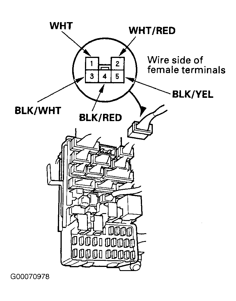 Fig 1: Identifying Ignition Switch Under-Dash Fuse/Relay Box Connector & Terminals (RSX)
