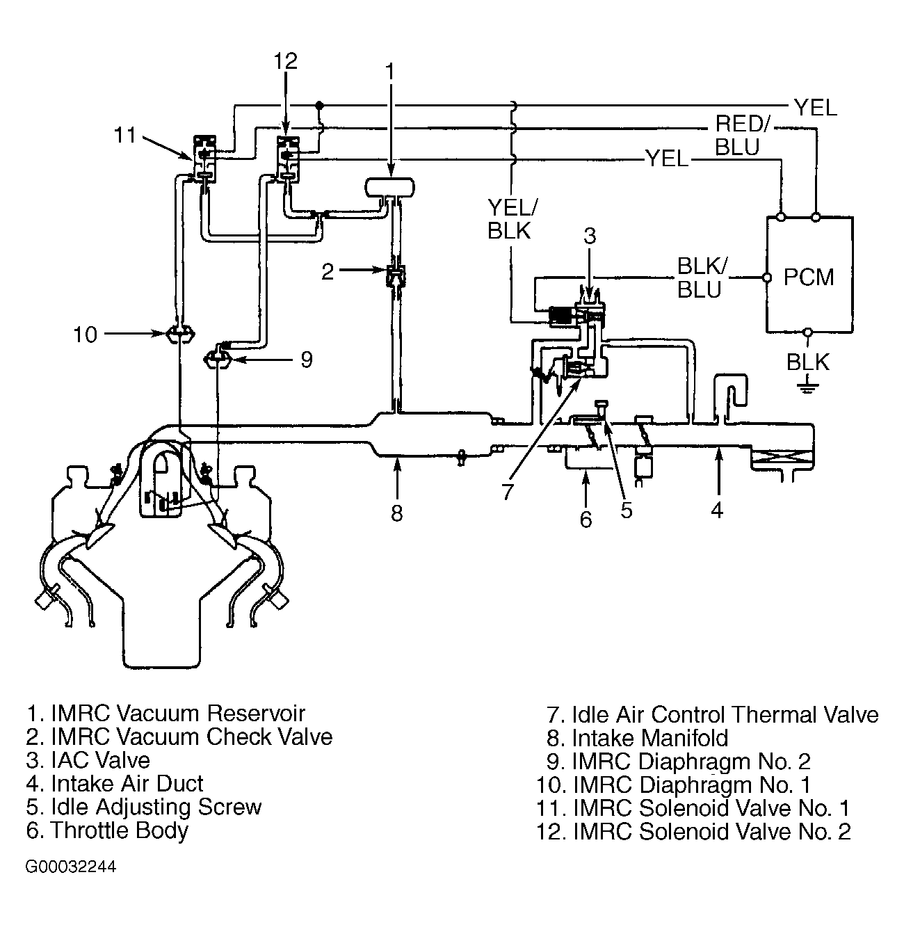 - With engine idling, disconnect vacuum hose No. 8 from IMRC diaphragm No. 2. Connect vacuum gauge to disconnected hose. If vacuum is present, go to next step. If vacuum is not present, go to step 10