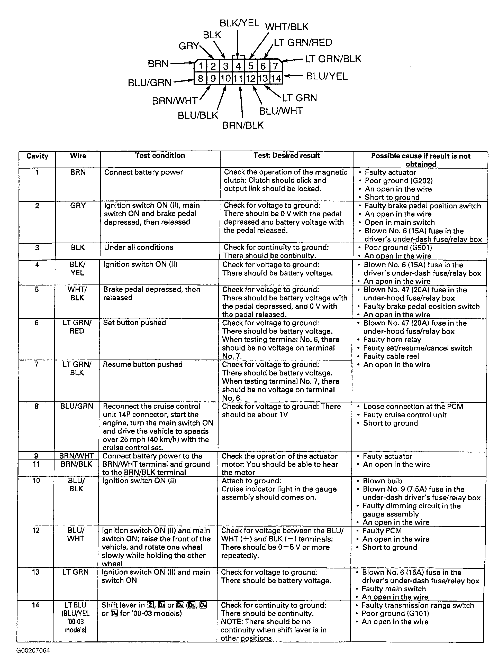 - Disconnect cruise control unit 14-pin connector. Ensure connector and terminals are okay. Repair as necessary and retest system. If connector and terminals are okay, perform cruise control unit input tests. See Figure. If an input test indicates a problem, find and correct cause and retest system. If all input test results are okay, replace cruise control unit.