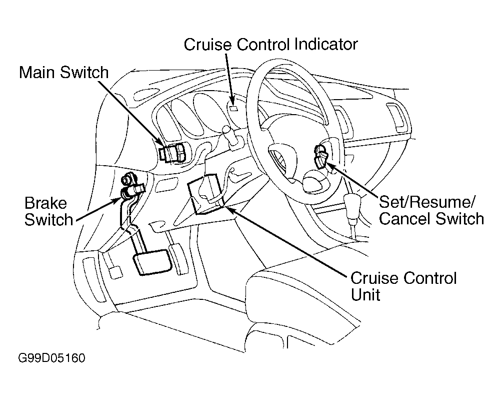 - Disable air bag system. Turn ignition off. Remove instrument panel lower left cover. Remove left knee bolster. Cruise control unit is located right of steering column. See Figure.