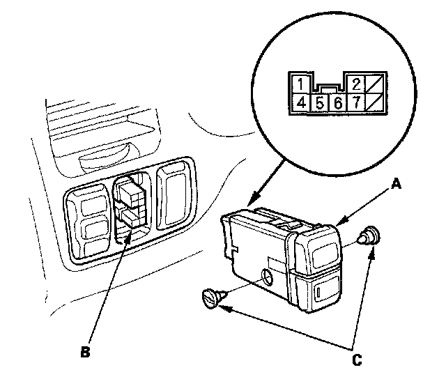 3. Check for continuity between the terminals in each switch position according to the table. If there is no continuity, replace the bulbs (C) or the switch.