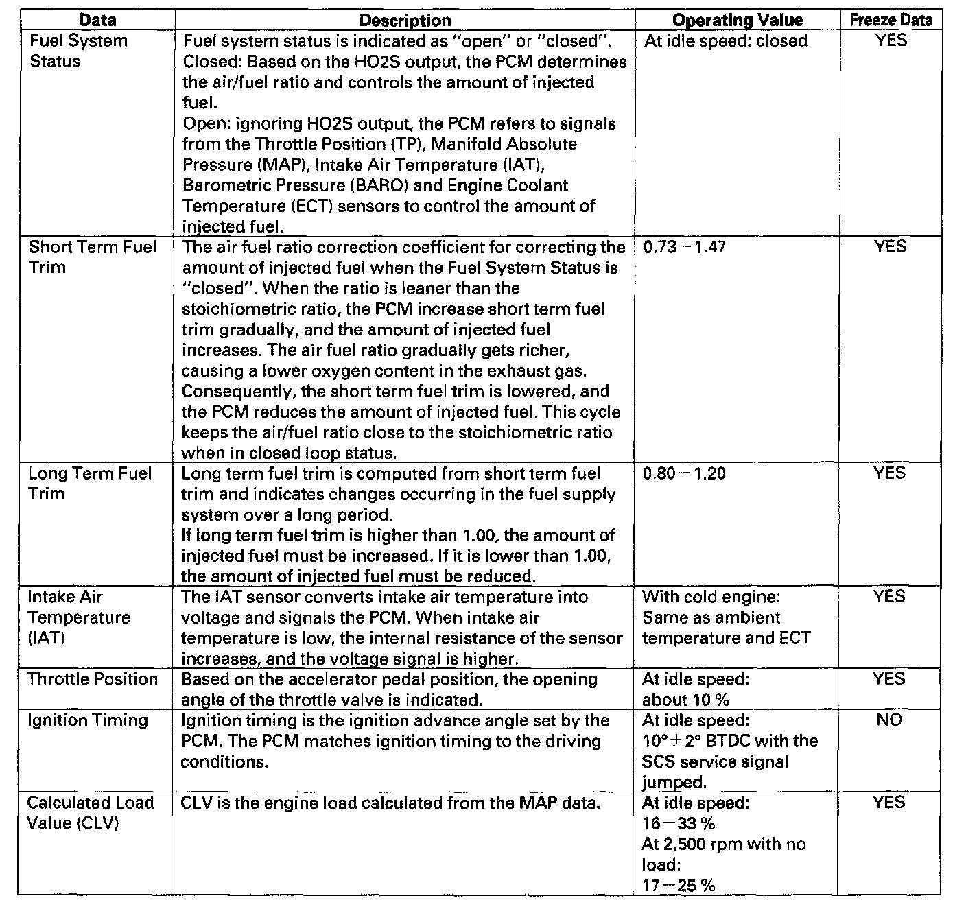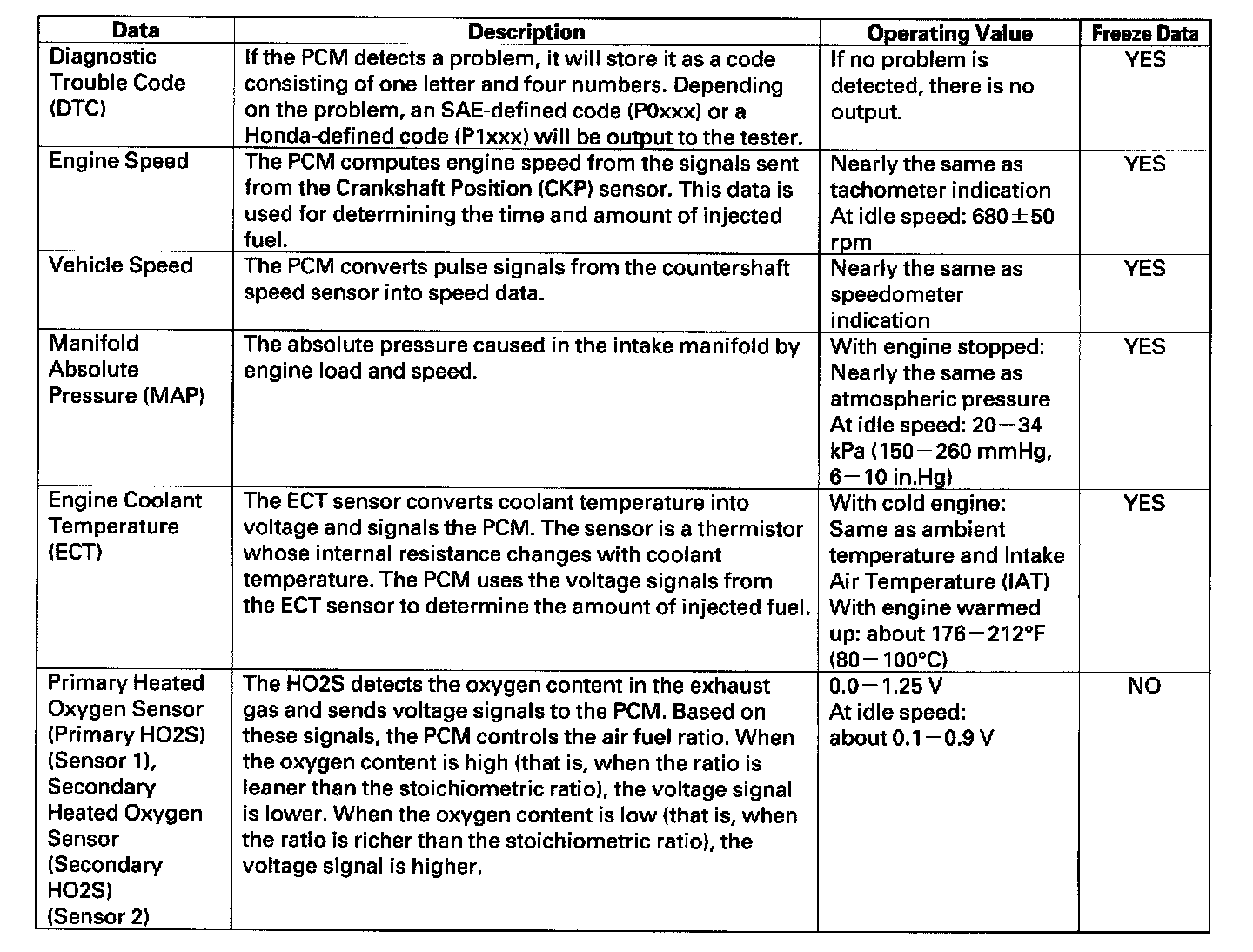 You can retrieve data from the PCM by connecting the OBD II scan tool or the Honda PGM Tester to the Data Link Connector (DLC). The items listed in the table conform to SAE recommended practice. The Honda PGM Tester also reads data beyond that recommended by SAE. Understanding this data may help you find the causes of intermittent problems.