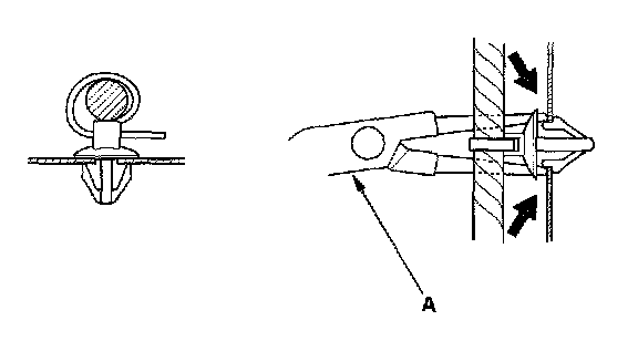 - Slip pliers (A) under the clip base and through the hole at an angle, then squeeze the expansion tabs to release the clip.