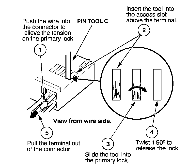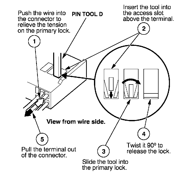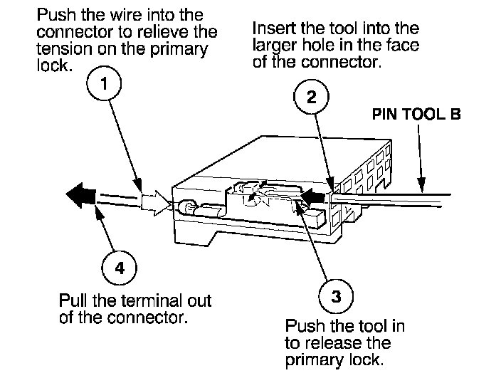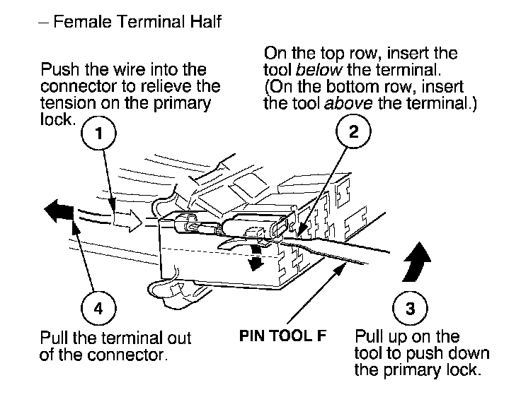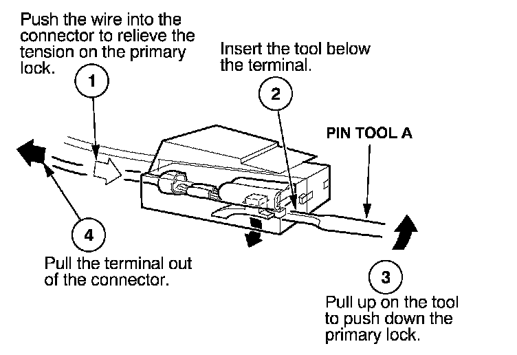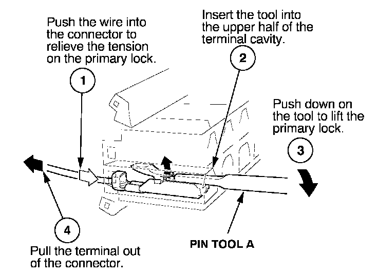 Before you begin, inspect the wire you are about to repair for damage and length. Make sure the wire will be long enough to make a terminal repair without stretching it when you reinstall the terminal in the connector. If the wire is too short, or if access to the connector is too restricted to make a terminal repair, you may need to install a pigtail terminal (a short length of wire with a factory-crimped terminal on it). Refer to HOW TO INSTALL PIGTAIL TERMINALS.