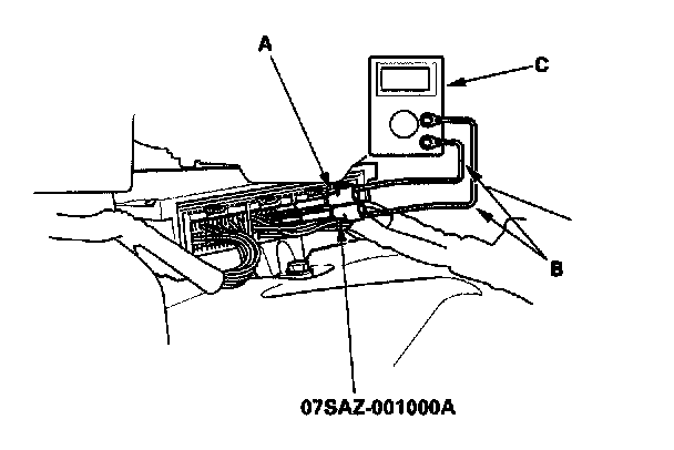 1. Connect the backprobe adapters (A) to the stacking patch cords (B), and connect the cords to a digital multimeter (C).