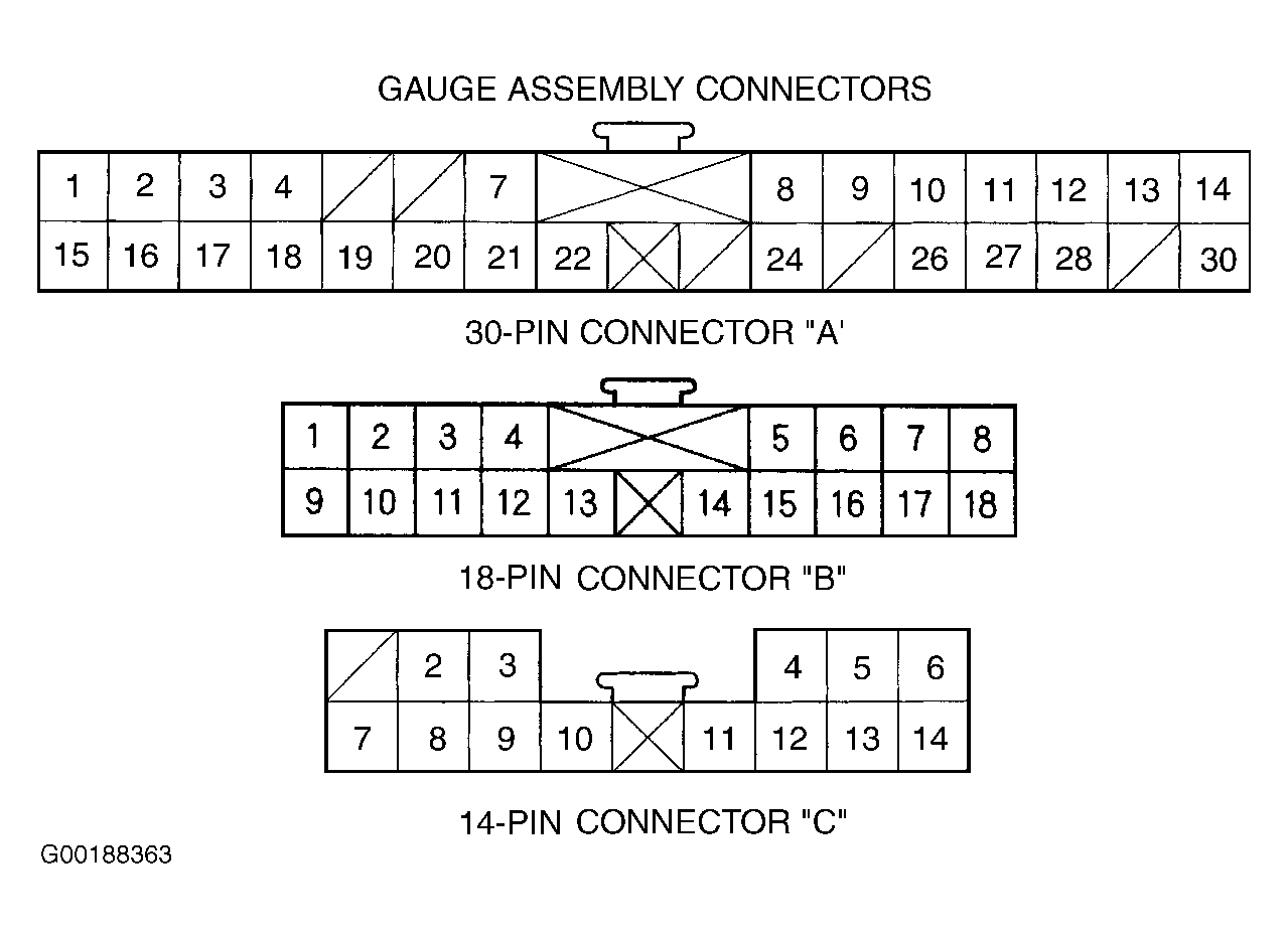 - Turn ignition off. Disconnect the gauge assembly 14-pin connector "C". See Fig 1 . Check for continuity between PCM harness connector terminal B51 (Light Green/White wire) and gauge assembly 14-pin connector terminal C6. If there is continuity, replace gauge assembly. Go to next step. If there is no continuity, repair open in wire between PCM harness connector terminal B51 (Light Green/White wire) and gauge assembly 14-pin connector terminal C6. Go to next step.
