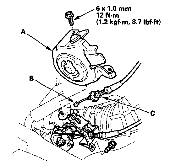 1. K20A3 engine: Remove the throttle cover (A), fully open the cruise control link by hand, then remove the cruise control cable (B) from link. Loosen the locknut (C), and remove the cable from the bracket.