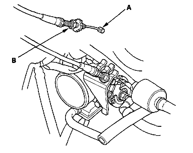 2. K20A2 engine: Fully open the cruise control link by hand, then remove the cruise control cable (A) from link. Loosen the locknut (B), and remove the cable from the bracket.