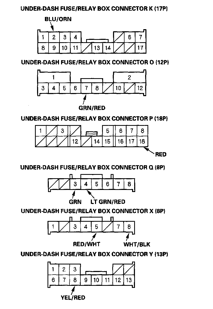 6. Reconnect the connectors to the under-dash fuse/relay box, and make these input tests at the appropriate connectors on the under-dash fuse/relay box